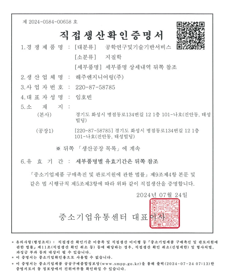 Á÷Á¢»ý»êÈ®ÀÎÁõ¸í¼ (ÁöÁú) 1. µî·ÏÀÏÀÚ: 2024. 7. 24 2. µî·Ï¹øÈ£: Á¦2024-0584-00658È£ 3. µî·ÏºÐ¾ß: °øÇבּ¸ ¹× ±â¼ú±â¹Ý¼ºñ½º, ÁöÁúÇÐ 4. ÁöÁ¤°üû: Áß¼Ò±â¾÷À¯Åë¼¾ÅÍ