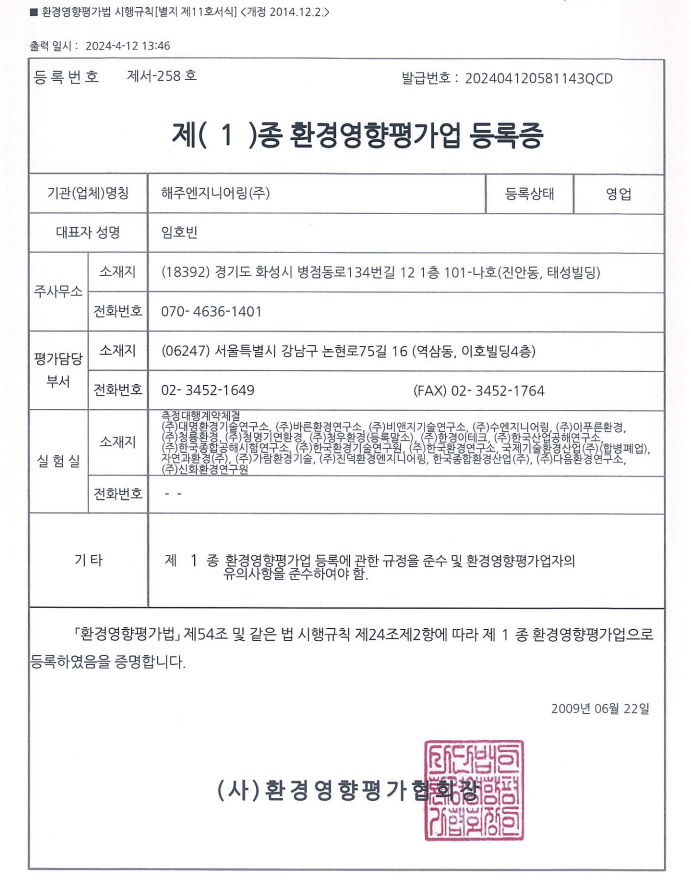 Á¦1Á¾ ȯ°æ¿µÇâÆò°¡¾÷ µî·Ï 1.µî·ÏÀÏÀÚ : 2009. 6. 22 2.µî·Ï¹øÈ£ : Á¦¼-258È£ 3.ÁöÁ¤°üû : (»ç)ȯ°æ¿µÇâÆò°¡Çùȸ