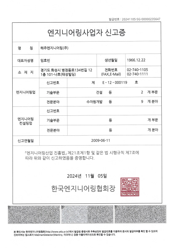 ¿£Áö´Ï¾î¸µ»ç¾÷ÀÚ ½Å°íÁõ 1.µî·ÏÀÏÀÚ : 2024. 11. 5 2.µî·Ï¹øÈ£ : Á¦ E-12-000119È£ 3.¾÷Á¾ : °Ç¼³ºÎ¹®, ¼öÀÚ¿ø°³¹ßºÐ¾ß 4.ÁöÁ¤°üû : Çѱ¹¿£Áö´Ï¾î¸µÇùȸ